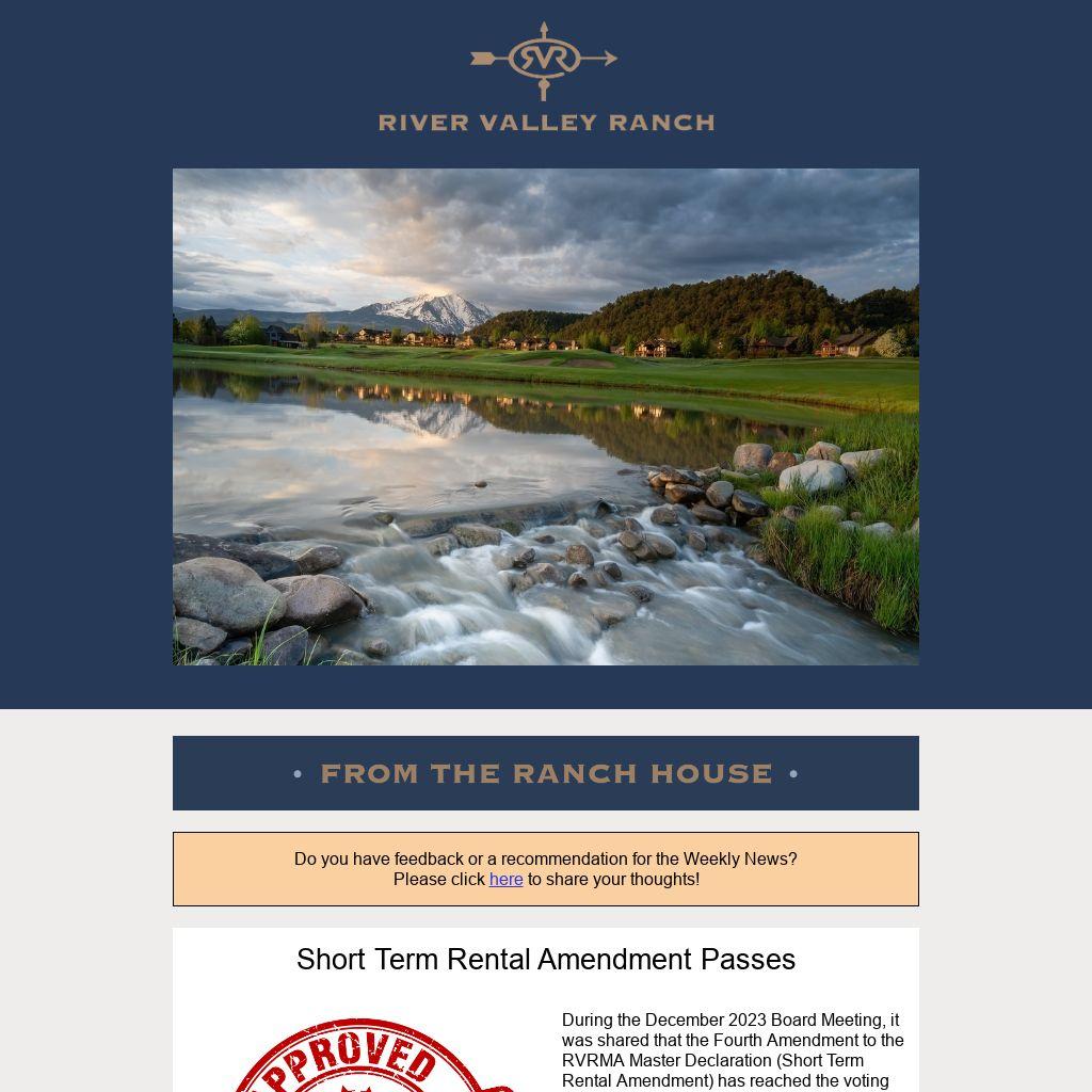 During the December 2023 Board Meeting, it was shared that the Fourth Amendment to the RVRMA Master Declaration (Short Term Rental Amendment) has reached the voting threshold to pass.