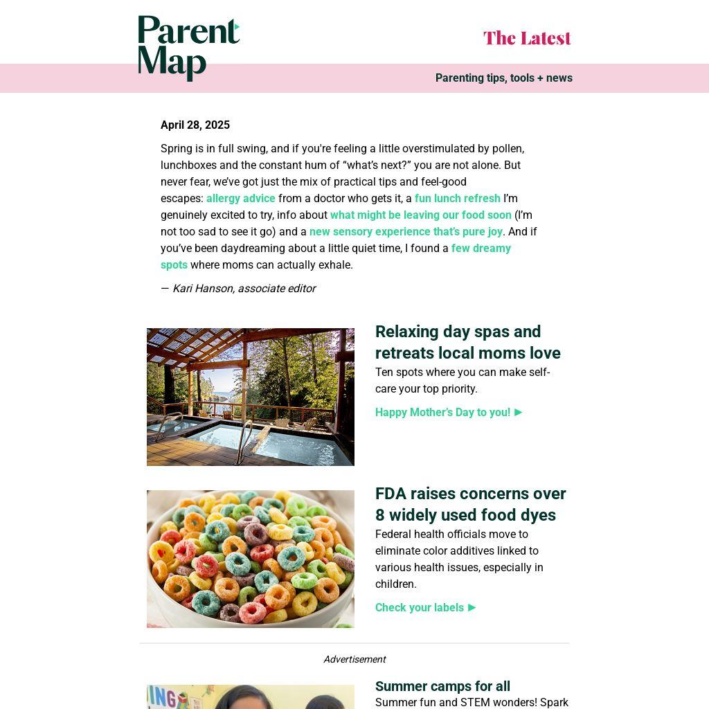 Spring is in full swing, and if you're feeling a little overstimulated by pollen, lunchboxes and the constant hum of “what’s next?” you are not alone. But never fear, we’ve got just the mix of practical tips and feel-good escapes: allergy advice from a doctor who gets it, a fun lunch refresh I’m genuinely excited to try, info about what might be leaving our food soon (I’m not too sad to see it go) and a new sensory experience that’s pure joy. And if you’ve been daydreaming about a little quiet time, I found a few dreamy spots where moms can actually exhale.Â