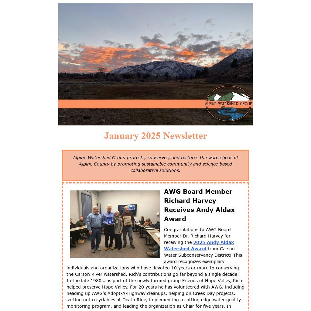 Congratulations to AWG Board Member Dr. Richard Harvey for receiving the 2025 Andy Aldax Watershed Award from Carson Water Subconservancy District! This award recognizes exemplary individuals and organizations who have devoted 10 years or more to conserving the Carson River watershed. Rich’s contributions go far beyond a single decade! In the late 1980s, as part of the newly formed group Friends of Hope Valley, Rich helped preserve Hope Valley. For 20 years he has volunteered with AWG, including heading up AWG’s Adopt-A-Highway cleanups, helping on Creek Day projects, sorting out recyclables at Death Ride, implementing a cutting edge water quality monitoring program, and leading the organization as Chair for five years. In accepting the award on January 15, Rich quoted Loren Eiseley: “If there is magic on the planet, it’s contained in water.” Rich added, “So I guess that makes us all magicians.” Thank you, Rich, for all of the magic you have shared with our watershed community.