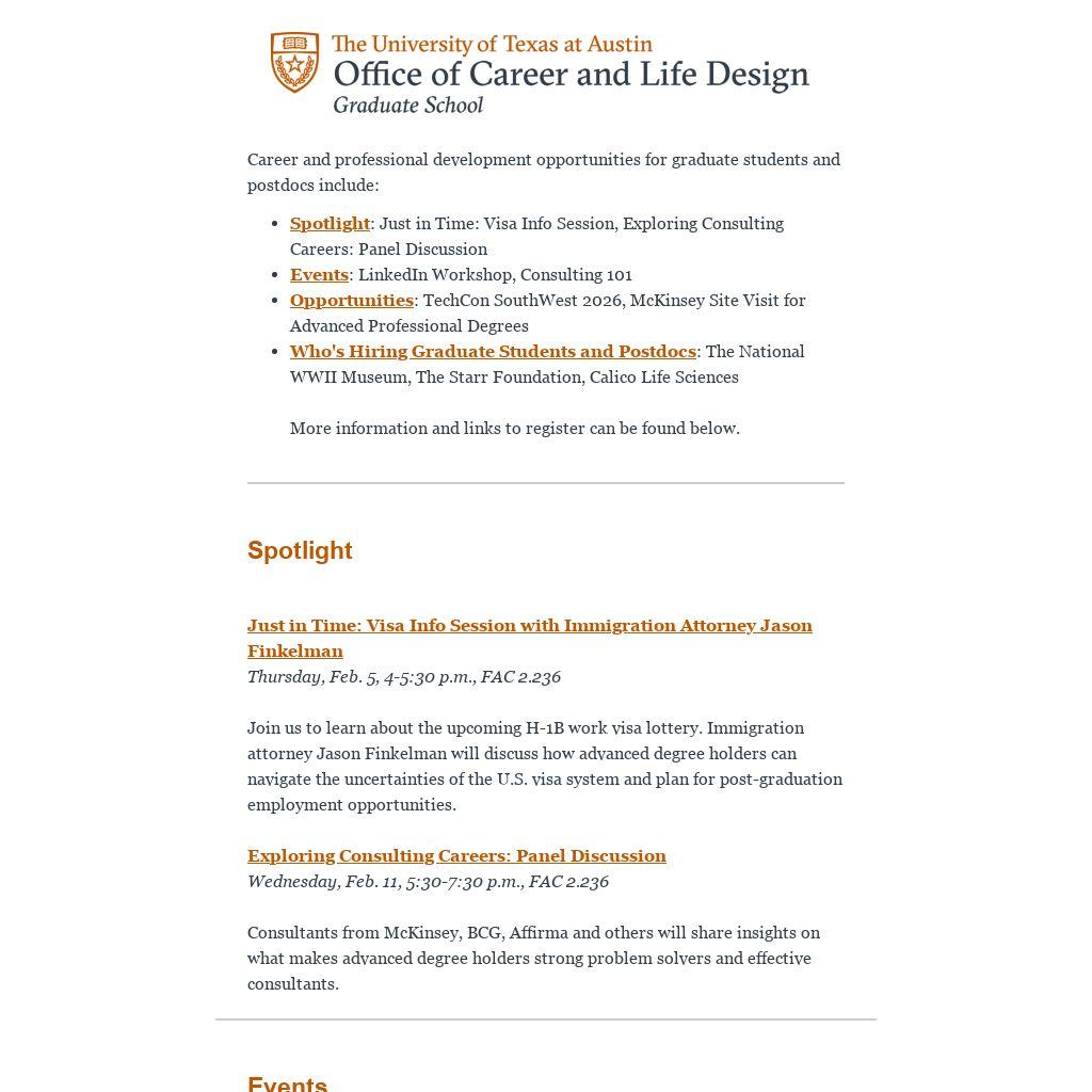 - Spotlight: Just in Time: Visa Info Session, Exploring Consulting Careers: Panel Discussion