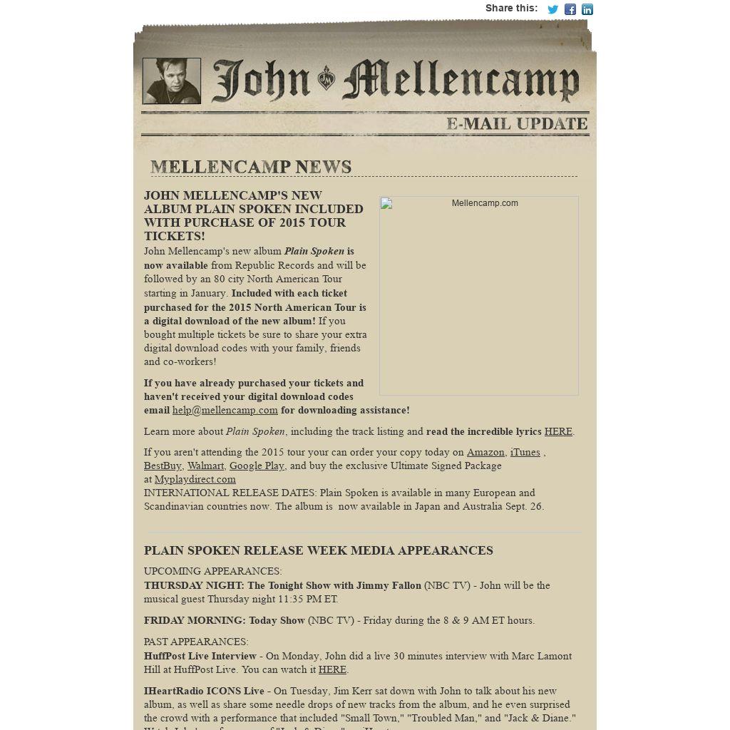 This Saturday night, Sept. 27 at 9 PM ET, AXS TV will present an intimate live performance by John Mellencamp. The Voice of the Heartland will feature a mix of songs from his newly released album, Plain Spoken and classic songs. The one-hour event titled “iHeartRadio Icons Live: John Mellencamp,” will be broadcast live from his Belmont Mall recording studio outside of Bloomington, Indiana. The concert is expected to also be broadcast on iHeartRadio and radio stations across the country.