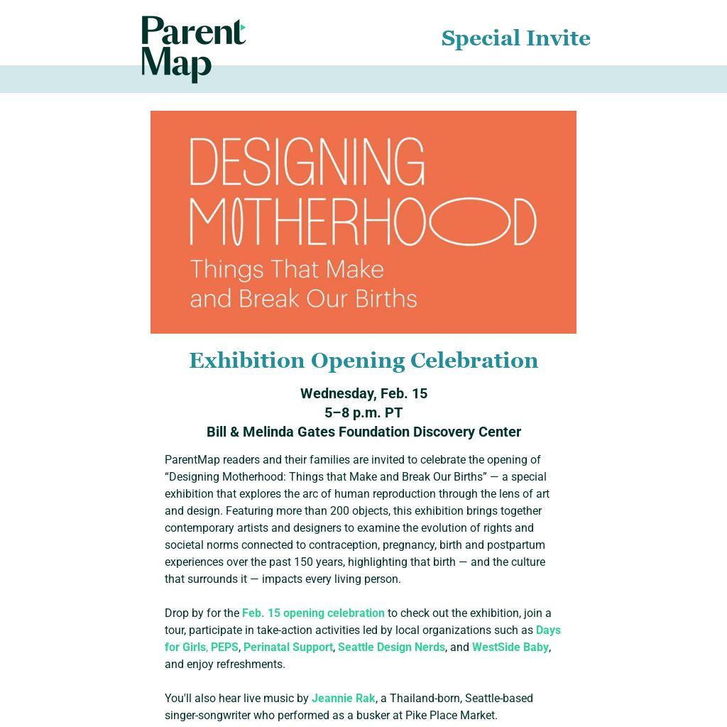 ParentMap readers and their families are invited to celebrate the opening of “Designing Motherhood: Things that Make and Break Our Births” — a special exhibition that explores the arc of human reproduction through the lens of art and design. Featuring more than 200 objects, this exhibition brings together contemporary artists and designers to examine the evolution of rights and societal norms connected to contraception, pregnancy, birth and postpartum experiences over the past 150 years, highlighting that birth — and the culture that surrounds it — impacts every living person.