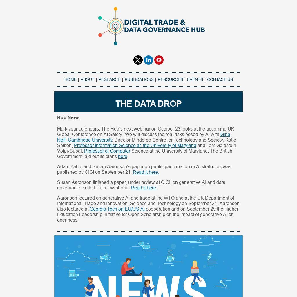 Mark your calendars. The Hub’s next webinar on October 23 looks at the upcoming UK Global Conference on AI Safety. We will discuss the real risks posed by AI with Gina Neff, Cambridge University, Director Minderoo Centre for Technology and Society; Katie Shilton, Professor Information Science at the University of Maryland and Tom Goldstein Volpi-Cupal, Professor of Computer Science at the University of Maryland. The British Government laid out its plans here.