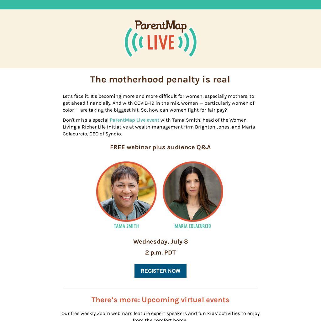 ParentMap Live event with Tama Smith, head of the Women Living a Richer Life initiative at wealth management firm Brighton Jones, and Maria Colacurcio, CEO of Syndio.