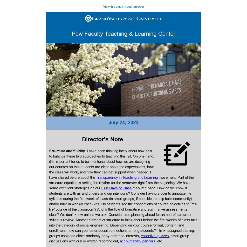 Whether you are teaching a course for the first time or are looking to strengthen a course to best engage students, we invite you to participate. The in-person and asynchronous components of this Institute will apply to a range of instructor experience levels and disciplines. The Pew FTLC is partnering with colleagues from Student Affairs and eLearning to provide a robust, hands-on learning experience with content directly applicable to our upcoming courses. The Institute is a renewal of the Strong Start Initiative launched originally in 2015 and has been shaped by the Academic Affairs Rapid Response Team, whose May 2023 report provided data analysis and recommendations for first-year student success.