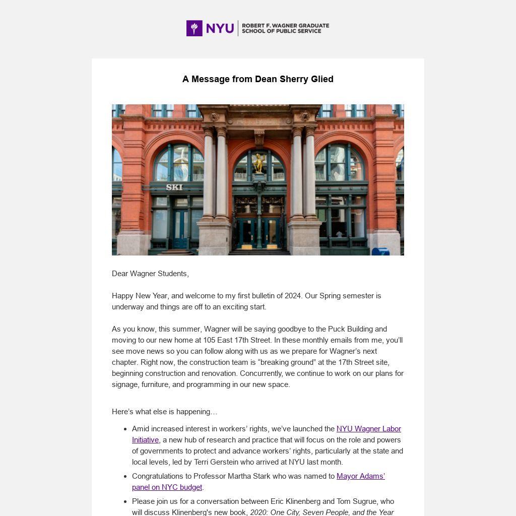 - Amid increased interest in workers’ rights, we’ve launched the NYU Wagner Labor Initiative, a new hub of research and practice that will focus on the role and powers of governments to protect and advance workers’ rights, particularly at the state and local levels, led by Terri Gerstein who arrived at NYU last month.