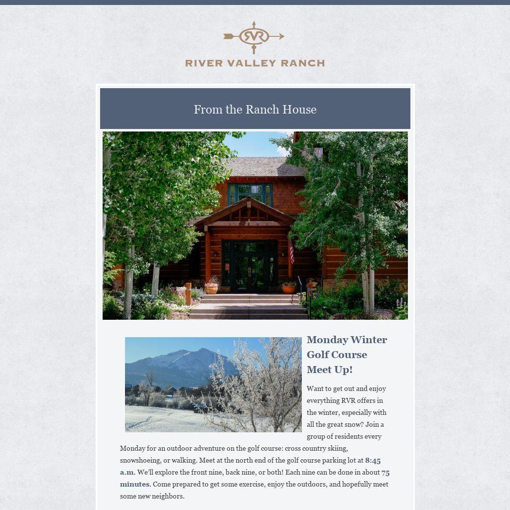 Want to get out and enjoy everything RVR offers in the winter, especially with all the great snow? Join a group of residents every Monday for an outdoor adventure on the golf course: cross country skiing, snowshoeing, or walking. Meet at the north end of the golf course parking lot at 8:45 a.m. We’ll explore the front nine, back nine, or both! Each nine can be done in about 75 minutes. Come prepared to get some exercise, enjoy the outdoors, and hopefully meet some new neighbors.