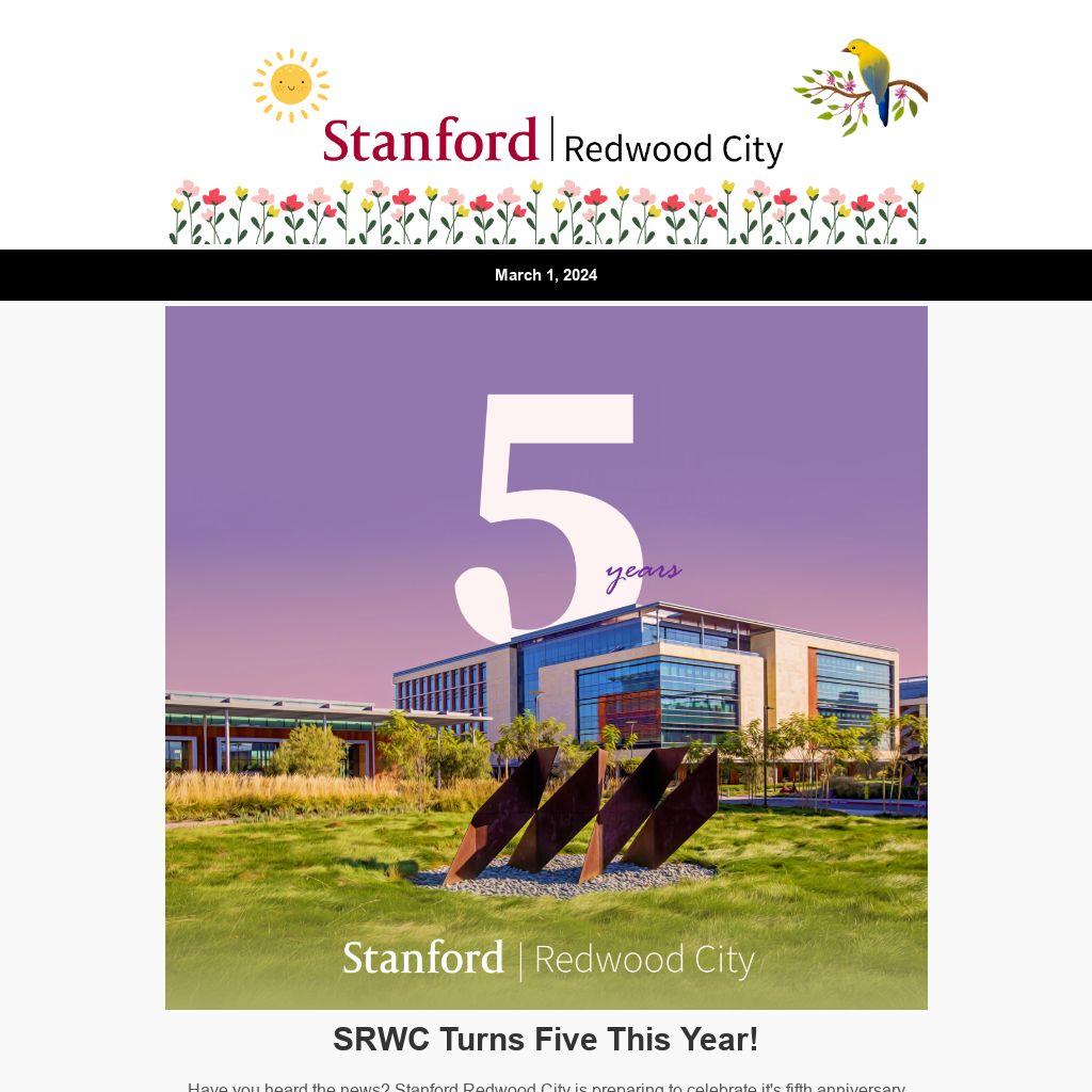 Have you heard the news? Stanford Redwood City is preparing to celebrate it's fifth anniversary this year. And to make it extra special, the Campus Services team has a bunch of activities planned from March-August 2024 so that we can join together as a community and be a part of this occasion. Here is a list of events that have been scheduled as a part of our anniversary celebrations. Watch for details on the event calendar and digital displays.