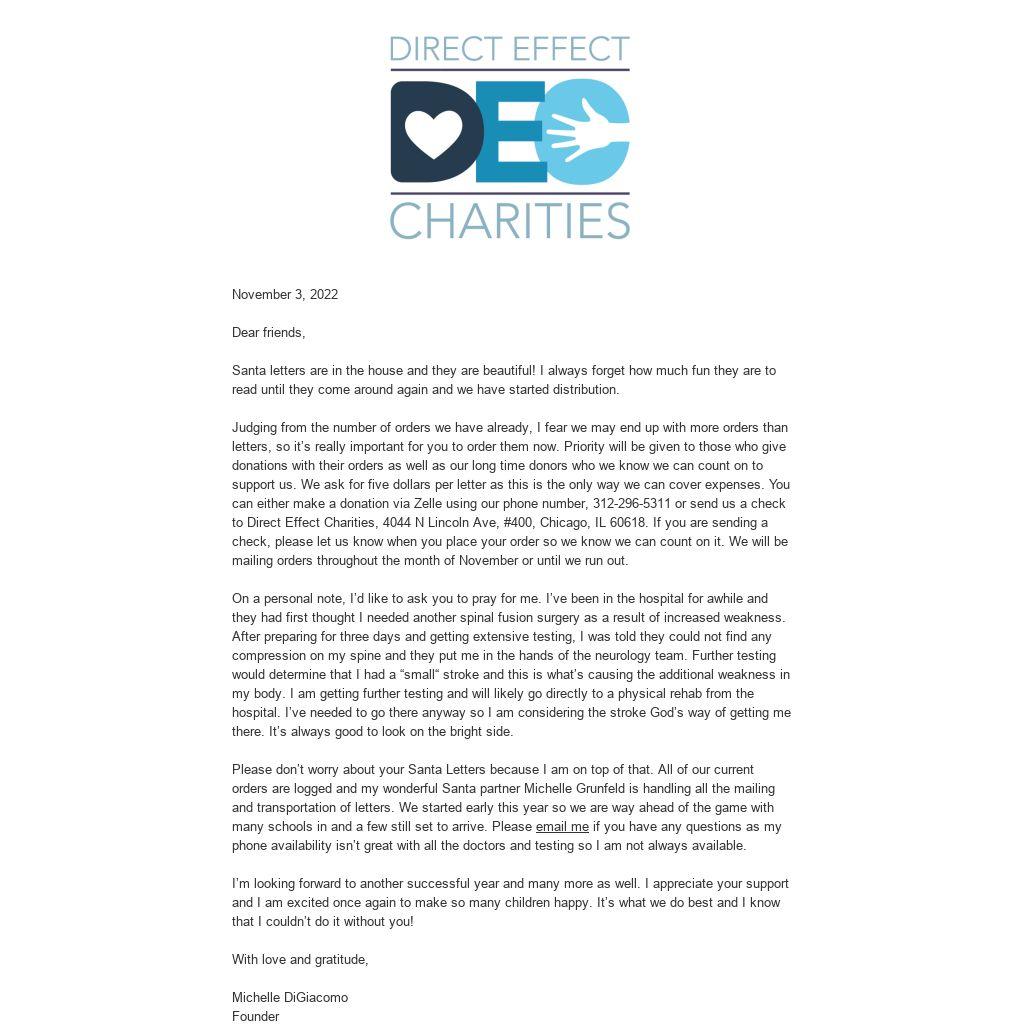 Judging from the number of orders we have already, I fear we may end up with more orders than letters, so it’s really important for you to order them now. Priority will be given to those who give donations with their orders as well as our long time donors who we know we can count on to support us. We ask for five dollars per letter as this is the only way we can cover expenses. You can either make a donation via Zelle using our phone number, 312-296-5311 or send us a check to Direct Effect Charities, 4044 N Lincoln Ave, #400, Chicago, IL 60618. If you are sending a check, please let us know when you place your order so we know we can count on it. We will be mailing orders throughout the month of November or until we run out.