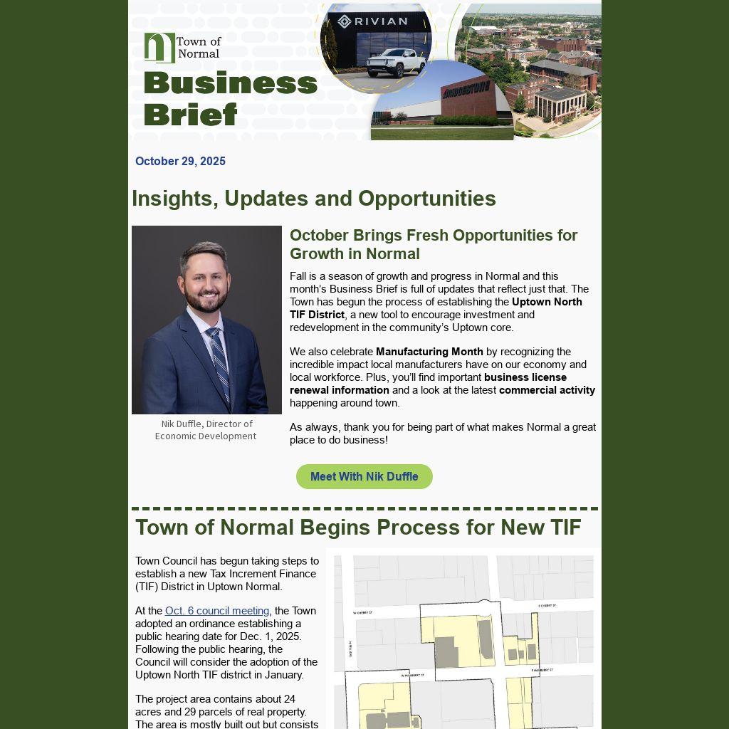 Fall is a season of growth and progress in Normal and this month’s Business Brief is full of updates that reflect just that. The Town has begun the process of establishing the Uptown North TIF District, a new tool to encourage investment and redevelopment in the community’s Uptown core.
