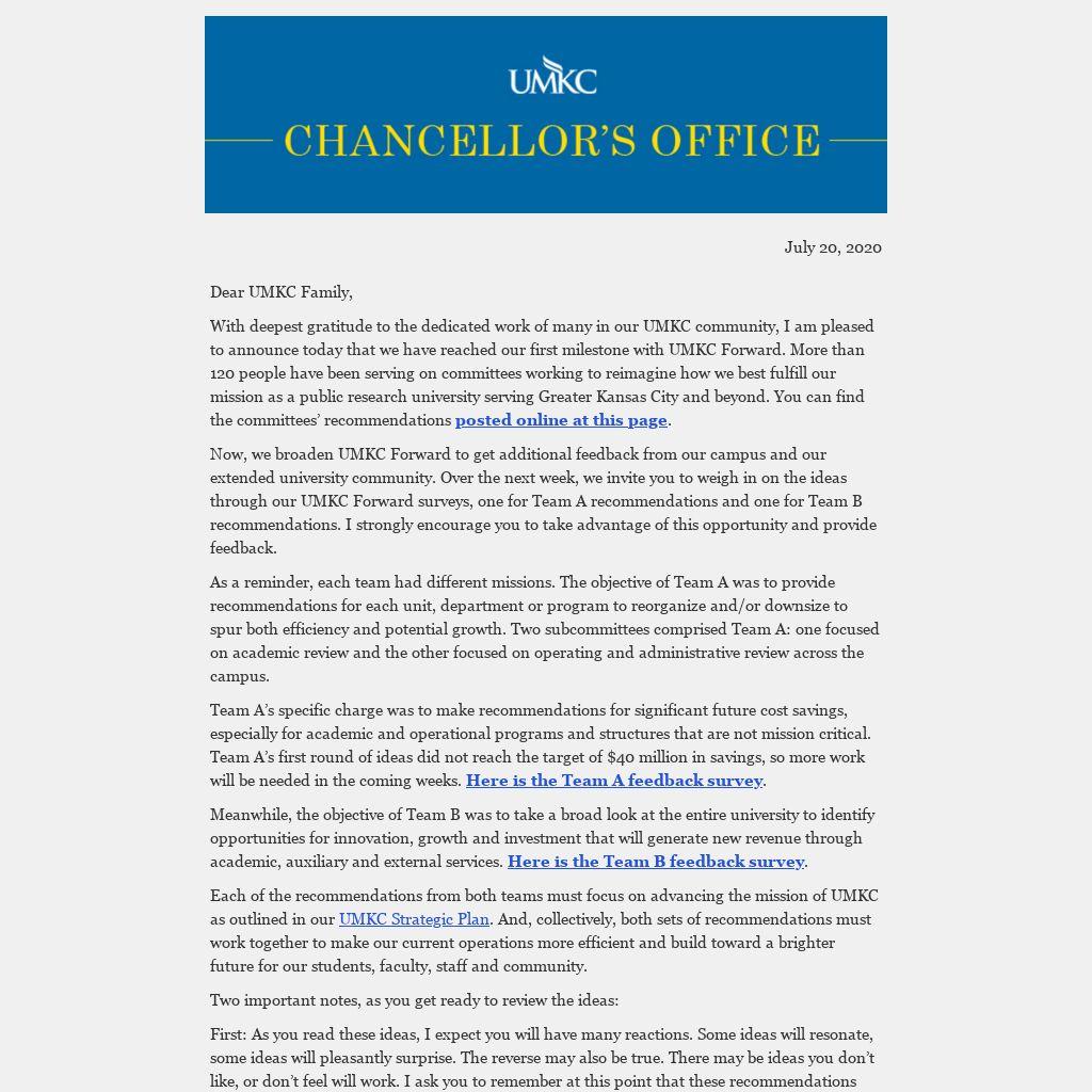 Now, we broaden UMKC Forward to get additional feedback from our campus and our extended university community. Over the next week, we invite you to weigh in on the ideas through our UMKC Forward surveys, one for Team A recommendations and one for Team B recommendations. I strongly encourage you to take advantage of this opportunity and provide feedback.