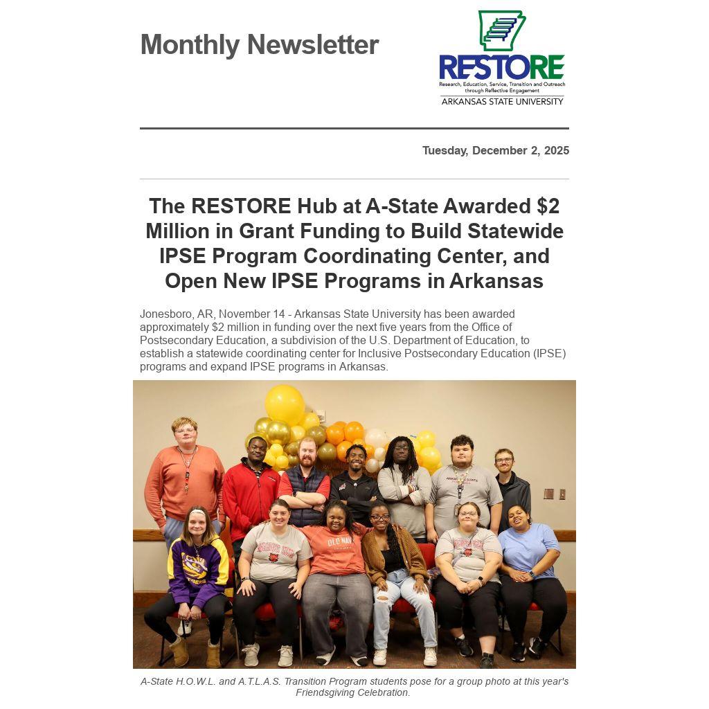 "The Consortium for Inclusive Postsecondary Education and Transition program is so exciting because it provides the opportunity for A-State’s RESTORE Hub to partner with other universities in Arkansas to create a statewide model for post-secondary education for young adults with disabilities. The RESTORE Hub researches best approaches to provide support and education to adults with intellectual and developmental disabilities and receiving this funding from the U.S. Department of Education provides the opportunity to make meaningful impact here in Arkansas. This was a very competitive grant cycle, and I’m very proud of Dr. Kristin Johnson and her team for submitting a quality proposal that was funded, so that they can continue their important work in Arkansas,” said Vice Provost for Research, Innovation, and Discovery and Executive Director of the Arkansas Biosciences Institute Dr. Travis Marsico.