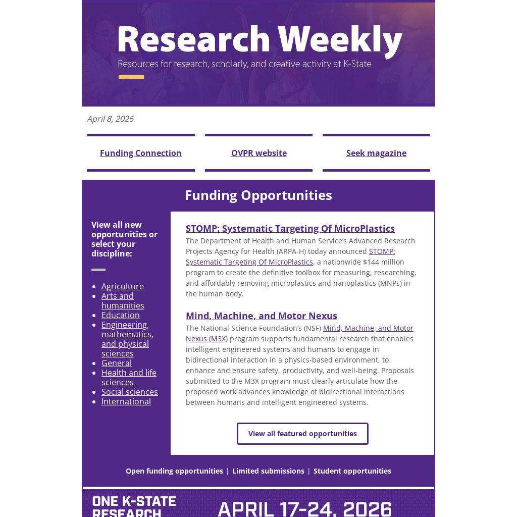 K-State faculty, postdocs, graduate students and staff engaged in research, scholarly, and creative activity and discovery are invited to attend this year's Research Connections event as a part of One K-State Research Week. This event will take place Monday, April 20, 2026, from 3-5 p.m. in the K-State Alumni Center Banquet Room.