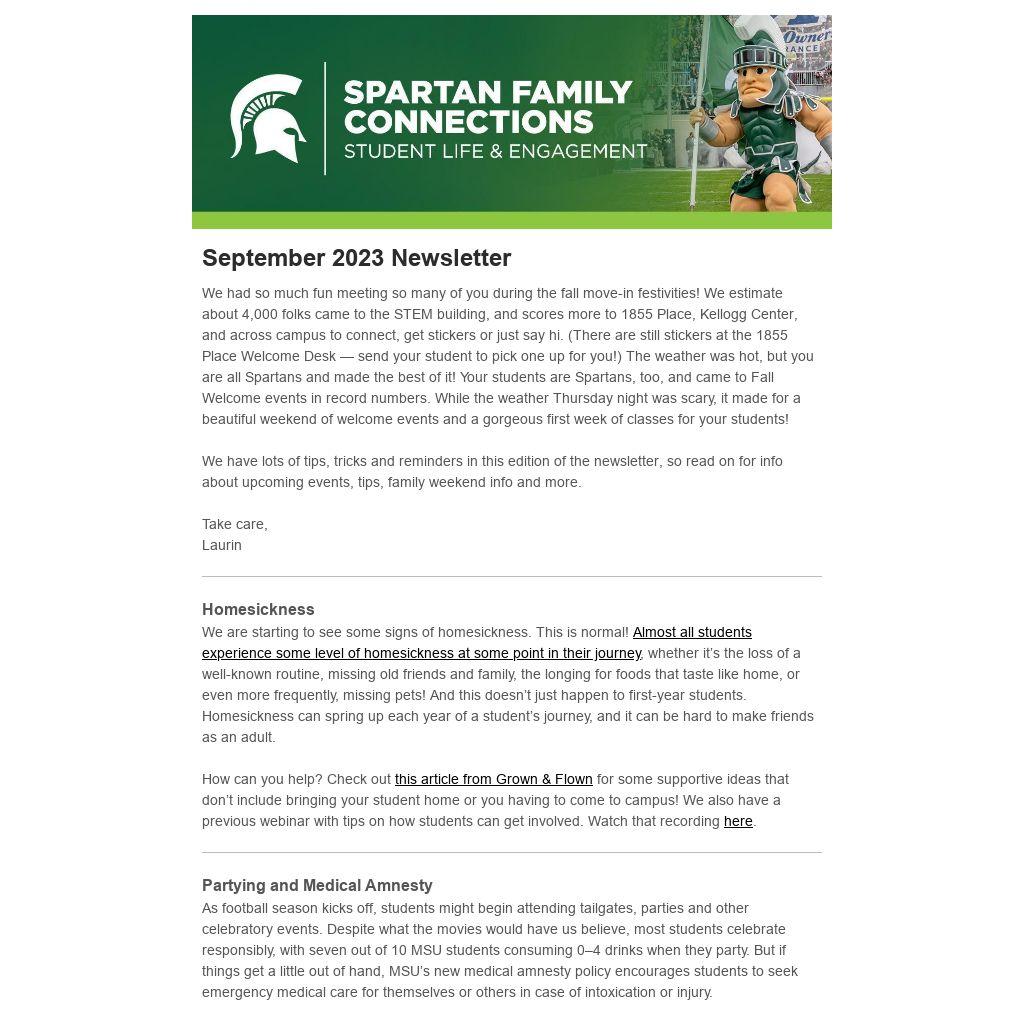 We are excited to be planning the 2023 MSU Family Weekend Presented by MSUFCU! This year’s Nov. 3-5 event will include a large resource and information fair for families checking in for Family Weekend, WKAR Open House, Dairy Farm tours, the Friday night MSU Women’s Volleyball game, a tailgate prior to the Saturday football game, a UAB event featuring MSU student performances, and Sunday seminars from Career Services Network, Undergraduate Education, MSU DPPS, Spartan Experience Record, Office of Community and Student Relations, and others. And we’re excited to welcome Interim President Woodruff and Interim Provost Jeitschko to speak at Sunday’s add-on ticketed event, Breakfast with Administration. You can find the weekend’s schedule here.