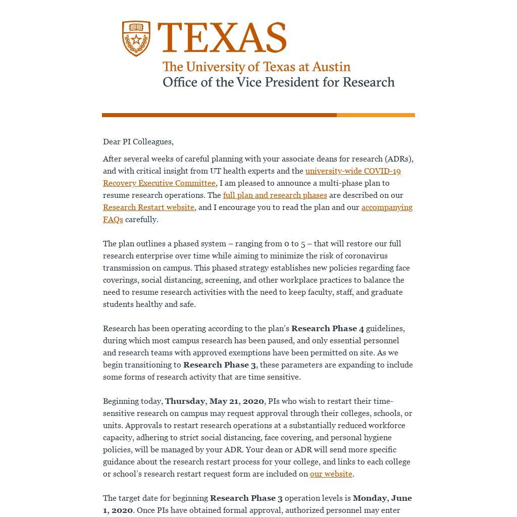 After several weeks of careful planning with your associate deans for research (ADRs), and with critical insight from UT health experts and the university-wide COVID-19 Recovery Executive Committee, I am pleased to announce a multi-phase plan to resume research operations. The full plan and research phases are described on our Research Restart website, and I encourage you to read the plan and our accompanying FAQs carefully. The plan outlines a phased system – ranging from 0 to 5 – that will restore our full research enterprise over time while aiming to minimize the risk of coronavirus transmission on campus. This phased strategy establishes new policies regarding face coverings, social distancing, screening, and other workplace practices to balance the need to resume research activities with the need to keep faculty, staff, and graduate students healthy and safe. Research has been operating according to the plan’s Research Phase 4 guidelines, during which most campus research has been paused, and only essential personnel and research teams with approved exemptions have been permitted on site. As we begin transitioning to Research Phase 3, these parameters are expanding to include some forms of research activity that are time sensitive. Beginning today, Thursday, May 21, 2020, PIs who wish to restart their time-sensitive research on campus may request approval through their colleges, schools, or units. Approvals to restart research operations at a substantially reduced workforce capacity, adhering to strict social distancing, face covering, and personal hygiene policies, will be managed by your ADR. Your dean or ADR will send more specific guidance about the research restart process for your college, and links to each college or school’s research restart request form are included on our website.