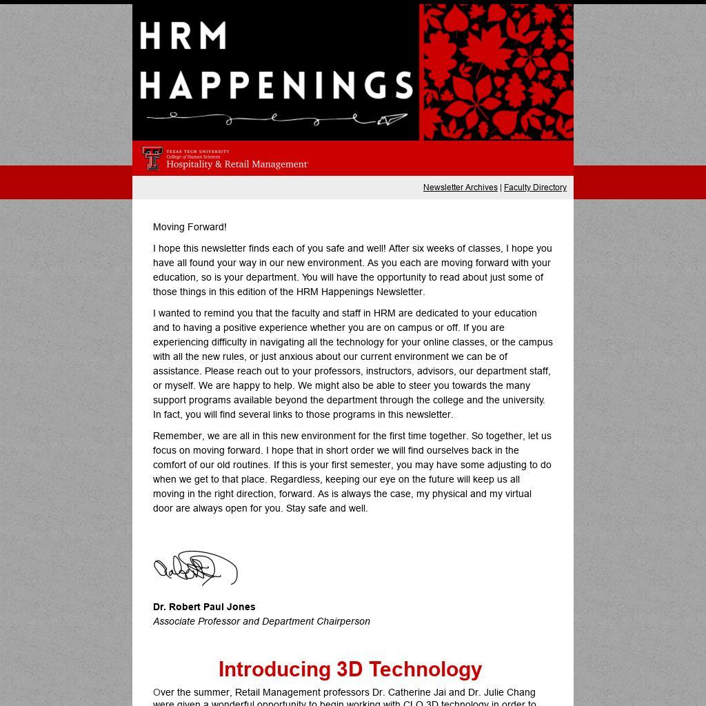 I wanted to remind you that the faculty and staff in HRM are dedicated to your education and to having a positive experience whether you are on campus or off. If you are experiencing difficulty in navigating all the technology for your online classes, or the campus with all the new rules, or just anxious about our current environment we can be of assistance. Please reach out to your professors, instructors, advisors, our department staff, or myself. We are happy to help. We might also be able to steer you towards the many support programs available beyond the department through the college and the university. In fact, you will find several links to those programs in this newsletter.