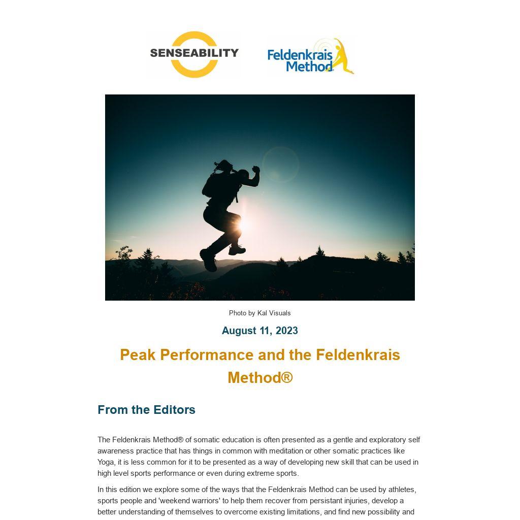 In this edition we explore some of the ways that the Feldenkrais Method can be used by athletes, sports people and 'weekend warriors' to help them recover from persistant injuries, develop a better understanding of themselves to overcome existing limitations, and find new possibility and potential in their movement. To help them get closer to the elusive idea of peak performance.