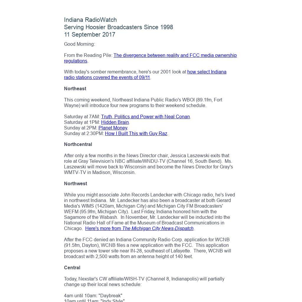 Indiana RadioWatch subscriptions are free. To subscribe, send an e-mail to irw@well.com and we'll add you. After publication, we archive Indiana RadioWatch on the Indiana Radio Archive at http://www.indianaradio.net. Please e-mail us your news stories and employment opportunities.