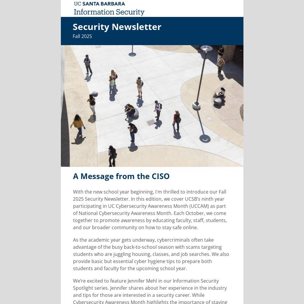 With the new school year beginning, I'm thrilled to introduce our Fall 2025 Security Newsletter. In this edition, we cover UCSB’s ninth year participating in UC Cybersecurity Awareness Month (UCCAM) as part of National Cybersecurity Awareness Month. Each October, we come together to promote awareness by educating faculty, staff, students, and our broader community on how to stay safe online.