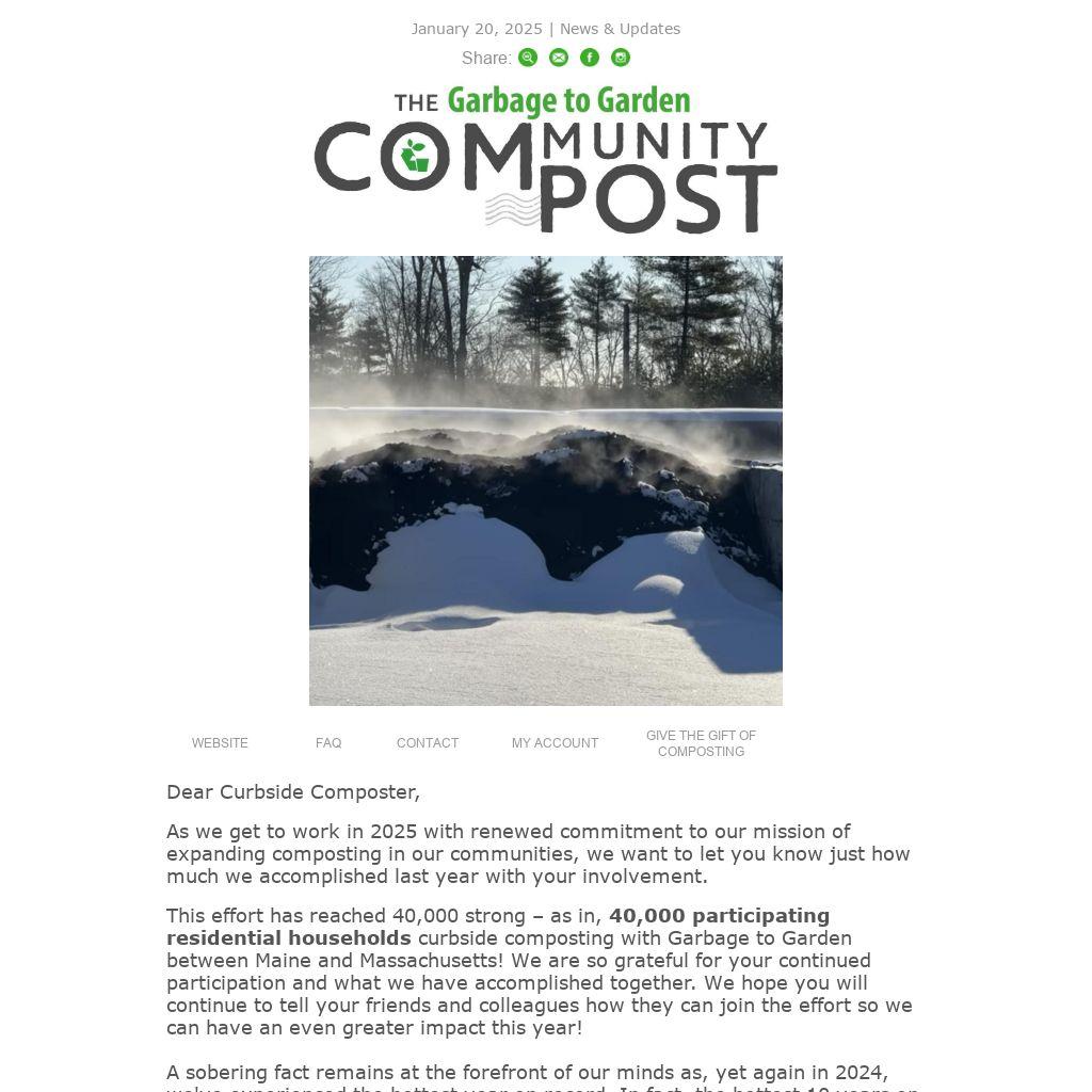This effort has reached 40,000 strong – as in, 40,000 participating residential households curbside composting with Garbage to Garden between Maine and Massachusetts! We are so grateful for your continued participation and what we have accomplished together. We hope you will continue to tell your friends and colleagues how they can join the effort so we can have an even greater impact this year!
