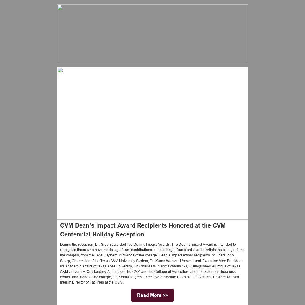 CVM Dean’s Impact Award Recipients Honored at the CVM Centennial Holiday Reception During the reception, Dr. Green awarded five Dean’s Impact Awards. The Dean’s Impact Award is intended to recognize those who have made significant contributions to the college. Recipients can be within the college, from the campus, from the TAMU System, or friends of the college. Dean’s Impact Award recipients included John Sharp, Chancellor of the Texas A&M University System, Dr. Karan Watson, Provost and Executive Vice President for Academic Affairs of Texas A&M University, Dr. Charles W. “Doc” Graham ’53, Distinguished Alumnus of Texas A&M University, Outstanding Alumnus of the CVM and the College of Agriculture and Life Sciences, business owner, and friend of the college, Dr. Kenita Rogers, Executive Associate Dean of the CVM, Ms. Heather Quiram, Interim Director of Facilities at the CVM.