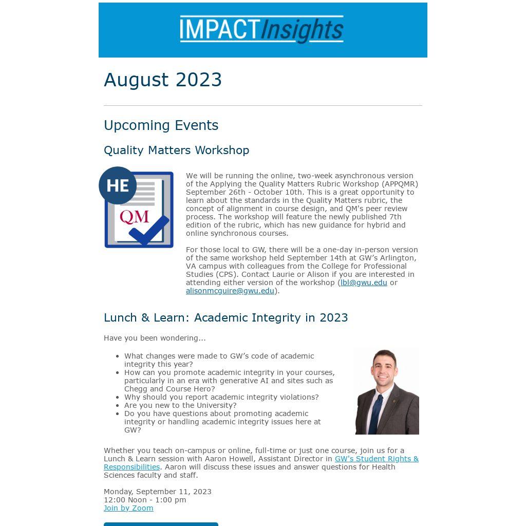 Whether you teach on-campus or online, full-time or just one course, join us for a Lunch & Learn session with Aaron Howell, Assistant Director in GW's Student Rights & Responsibilities. Aaron will discuss these issues and answer questions for Health Sciences faculty and staff.