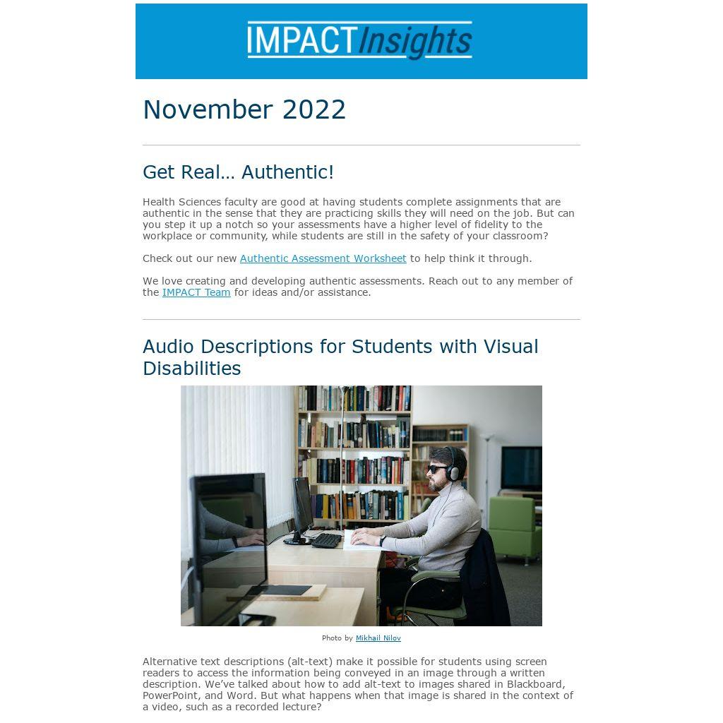 Alternative text descriptions (alt-text) make it possible for students using screen readers to access the information being conveyed in an image through a written description. We’ve talked about how to add alt-text to images shared in Blackboard, PowerPoint, and Word. But what happens when that image is shared in the context of a video, such as a recorded lecture?