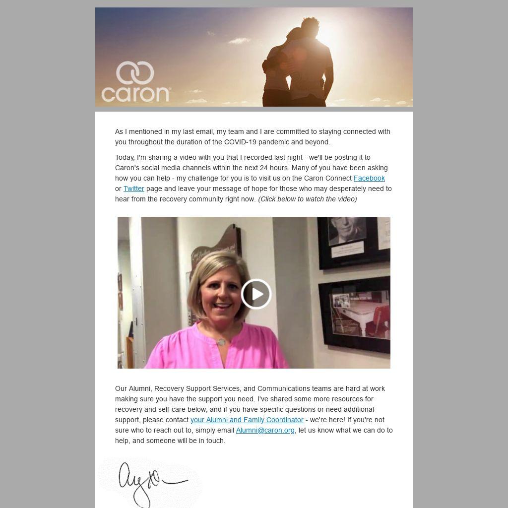Today, I'm sharing a video with you that I recorded last night - we'll be posting it to Caron's social media channels within the next 24 hours. Many of you have been asking how you can help - my challenge for you is to visit us on the Caron Connect Facebook or Twitter page and leave your message of hope for those who may desperately need to hear from the recovery community right now. (Click below to watch the video)