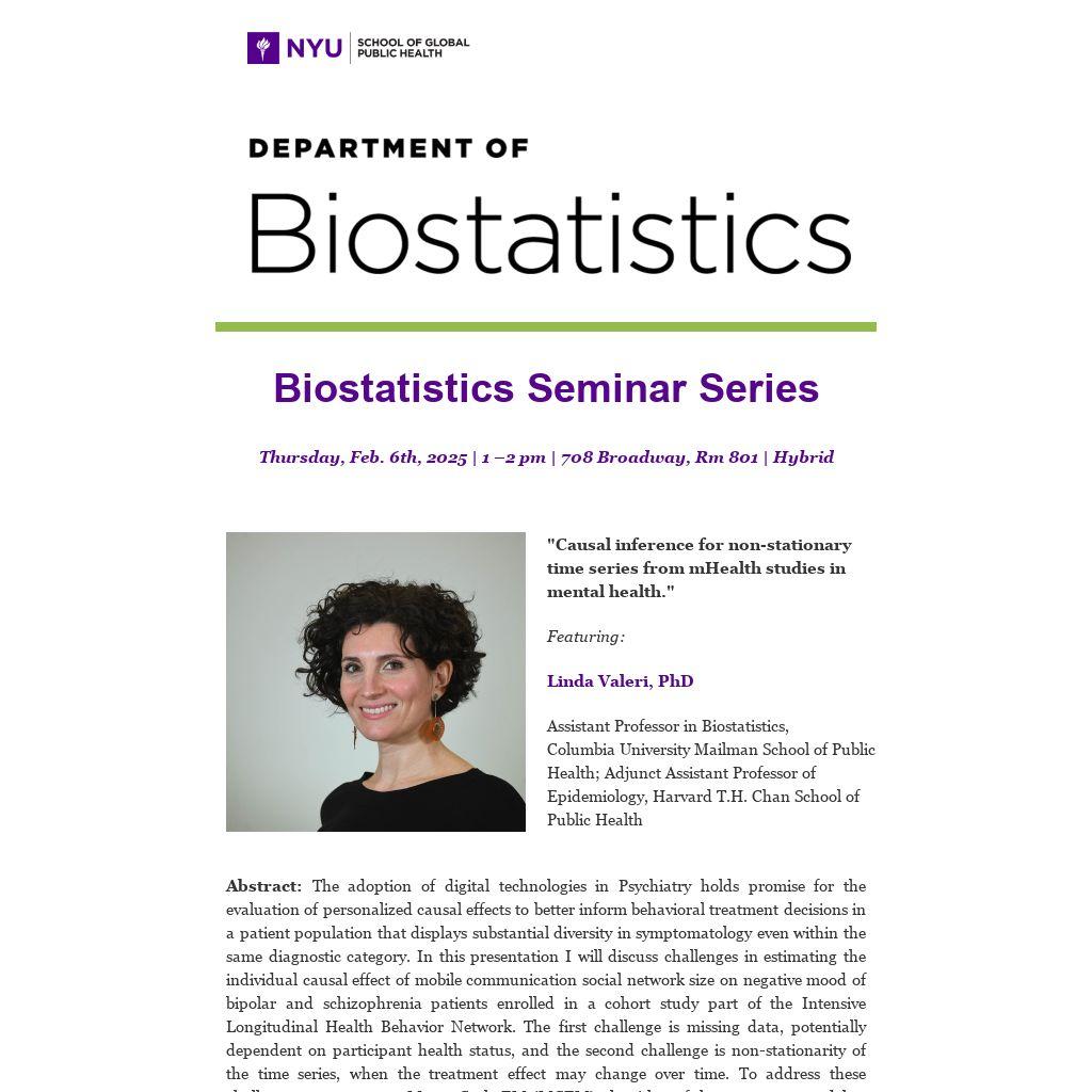 About the speaker: Linda Valeri, Assistant Professor of Biostatistics at Columbia University and Adjunct Assistant Professor of Epidemiology at Harvard University, is an expert biostatistician specializing in causal inference, with a focus on biostatistical methodology and statistical learning. She received her doctorate degree in Biostatistics from Harvard University. Her research encompasses causal mediation analysis, measurement error, missing data, and the integration of data from multiple sources, such as smartphone and wearable devices, life-course cohort studies, and electronic medical records, in diverse populations. Dr. Valeri has developed widely utilized open-access computational tools for causal inference, benefiting scientists across biomedical and social sciences. As PI of a career development award from the National Institute of Mental Health, of an R01 research grant from the National Institute of Aging and of an R21 from the National Institute of Environmental Health Sciences she collaborates with interdisciplinary teams to advance our understanding of mental health across the life-course, environmental determinants of health, and health disparities, contributing to informed policy-making. Finally, she serves as co-editor of the Data Science section of the journal Current Environmental Health Reports, Associate Editor for the International Journal of Biostatistics, as Statistical Editor for JAMA Psychiatry.