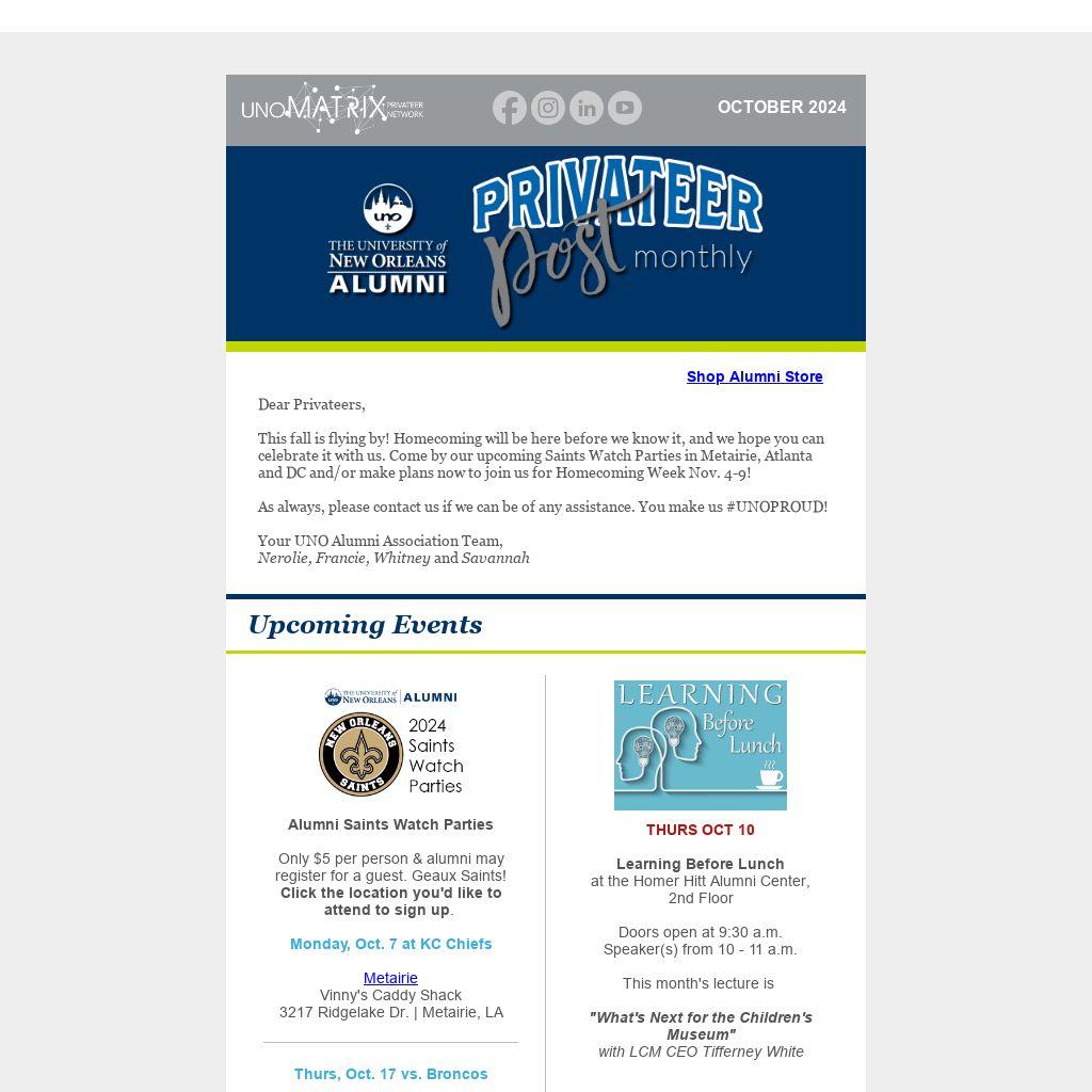 This fall is flying by! Homecoming will be here before we know it, and we hope you can celebrate it with us. Come by our upcoming Saints Watch Parties in Metairie, Atlanta and DC and/or make plans now to join us for Homecoming Week Nov. 4-9!