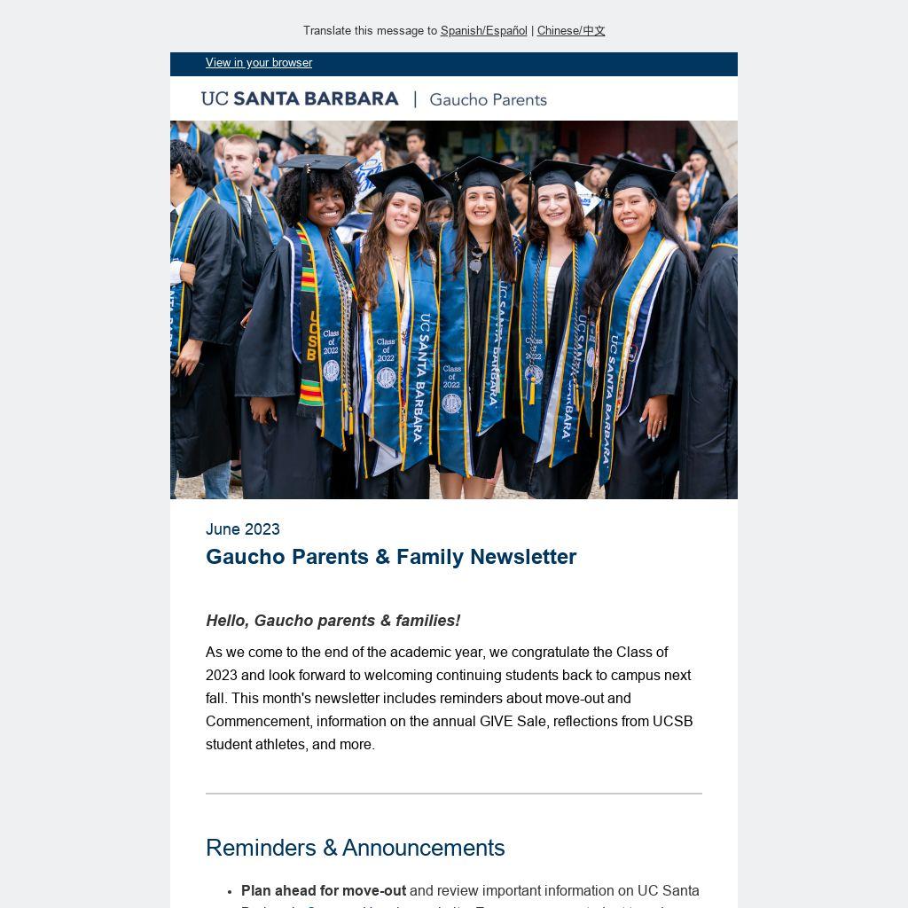 As we come to the end of the academic year, we congratulate the Class of 2023 and look forward to welcoming continuing students back to campus next fall. This month's newsletter includes reminders about move-out and Commencement, information on the annual GIVE Sale, reflections from UCSB student athletes, and more.