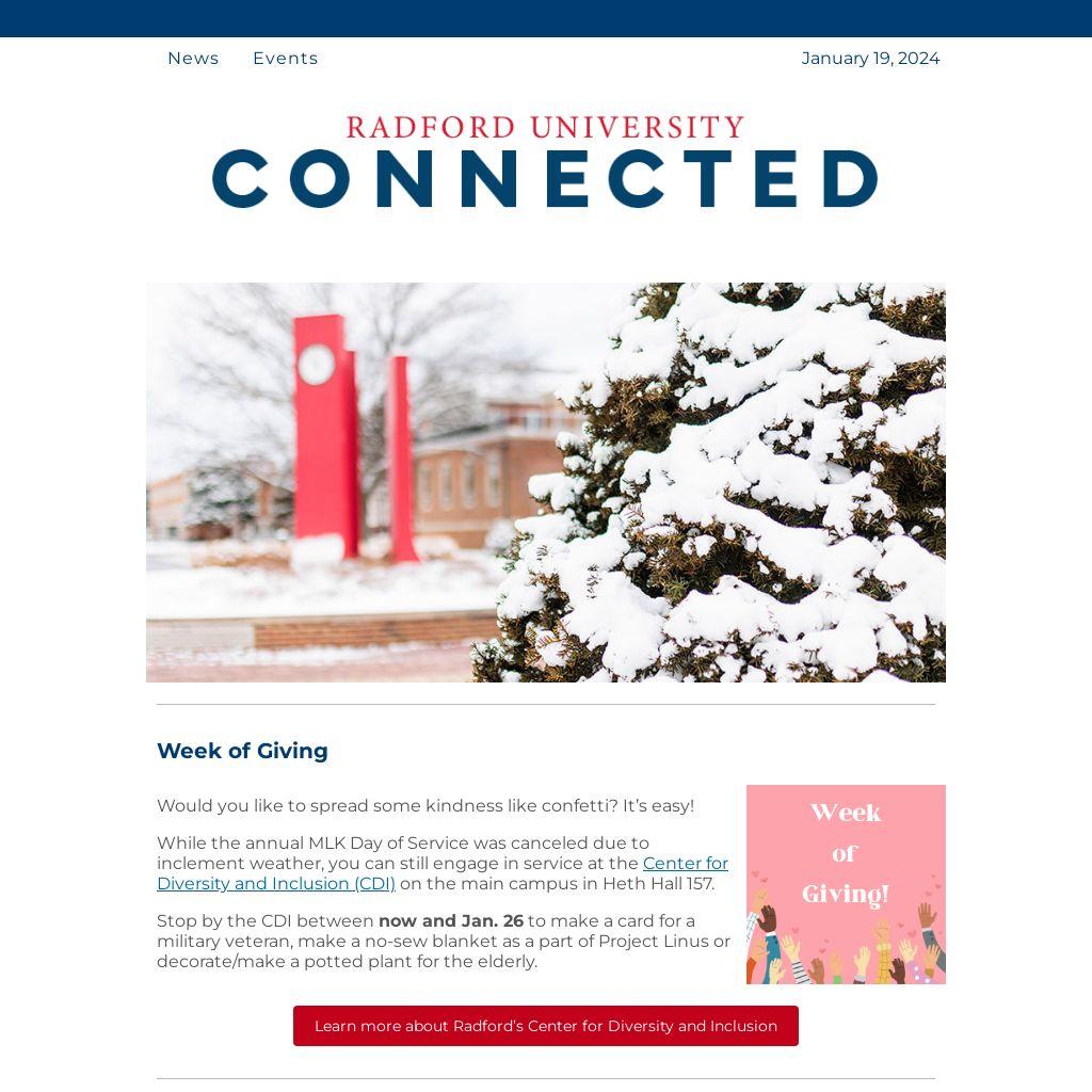 While the annual MLK Day of Service was canceled due to inclement weather, you can still engage in service at the Center for Diversity and Inclusion (CDI) on the main campus in Heth Hall 157.