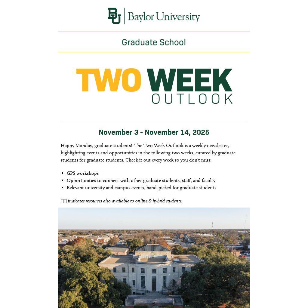Happy Monday, graduate students! Â The Two Week Outlook is a weekly newsletter, highlighting events and opportunities in the following two weeks, curated by graduate students for graduate students. Check it out every week so you don't miss: