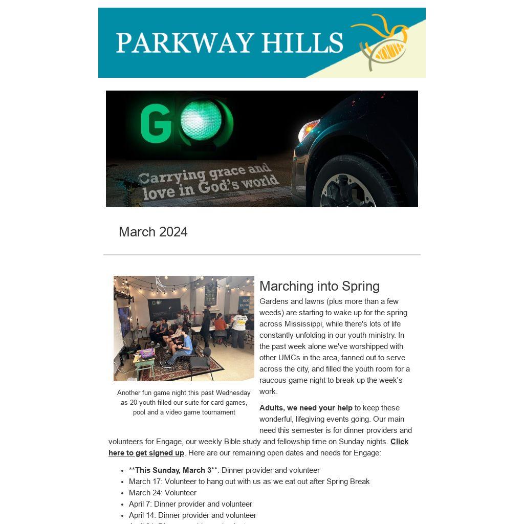 April 28: PHUMC evening at the park--No Engage this night as our whole church family is invited to Liberty Park. Keep an eye out for the main PHUMC newsletter for more info.