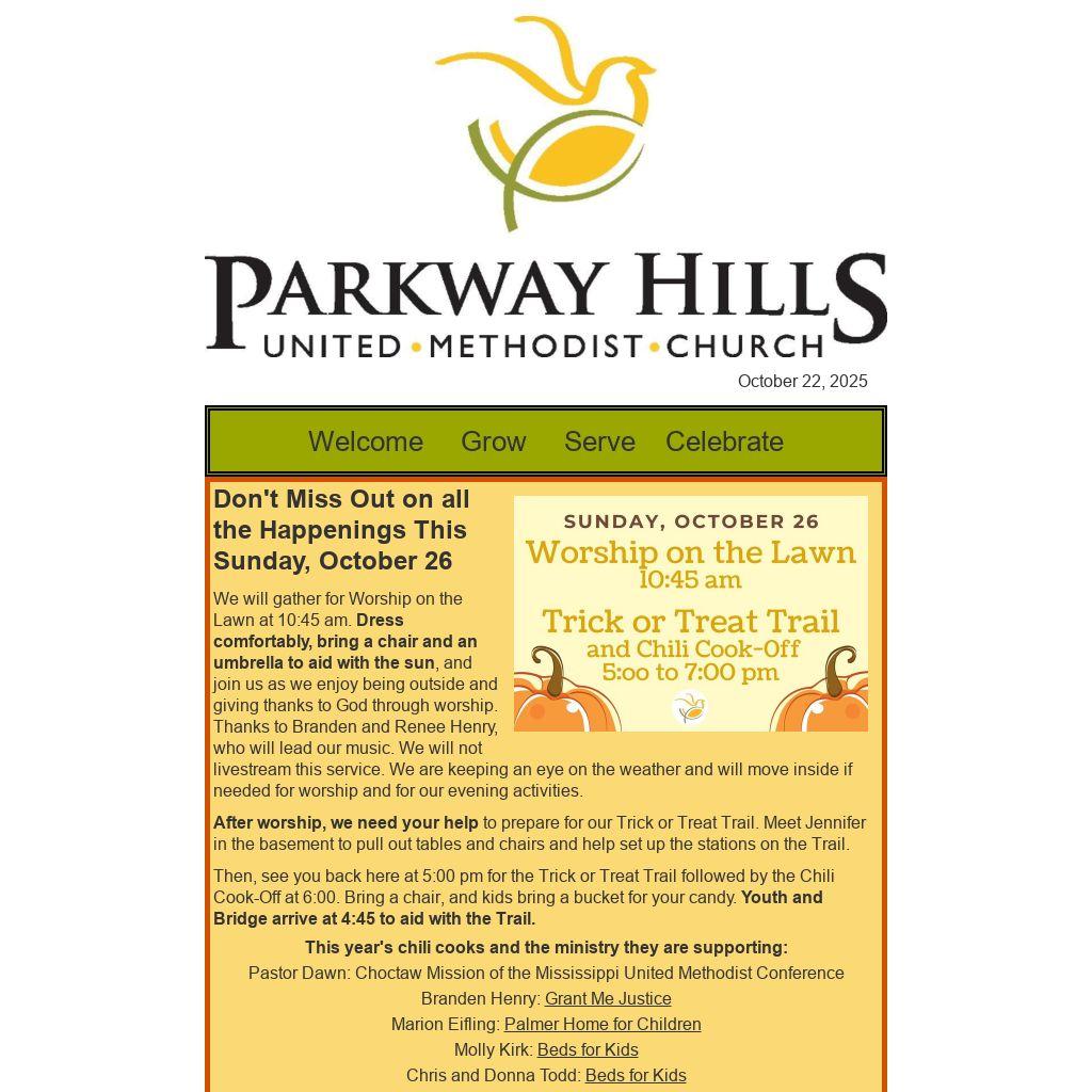 Sunday: Sunday Morning Small Groups at 9:30 am; Worship on the Lawn at 10:45 am; Choir practice 4:00 pm ahead of Trick or Treat Trail and Chili Cook-off at 5:00 pm