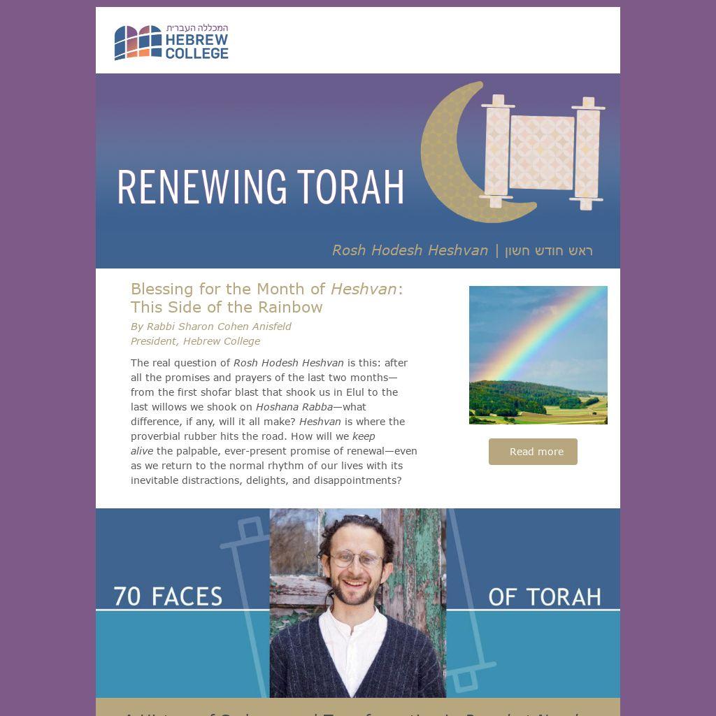 On October 20, Hebrew College hosted the online event Turn It and Turn It Again: Renewing Our Torah Journey to celebrate the beginning of another year of Jewish learning and community with Hebrew College and friends. The event featured an introduction by Rabbi Sharon Cohen Anisfeld, President of Hebrew College, followed by breakout teaching sessions with Hebrew College faculty members. Watch sessions by clicking the links below.