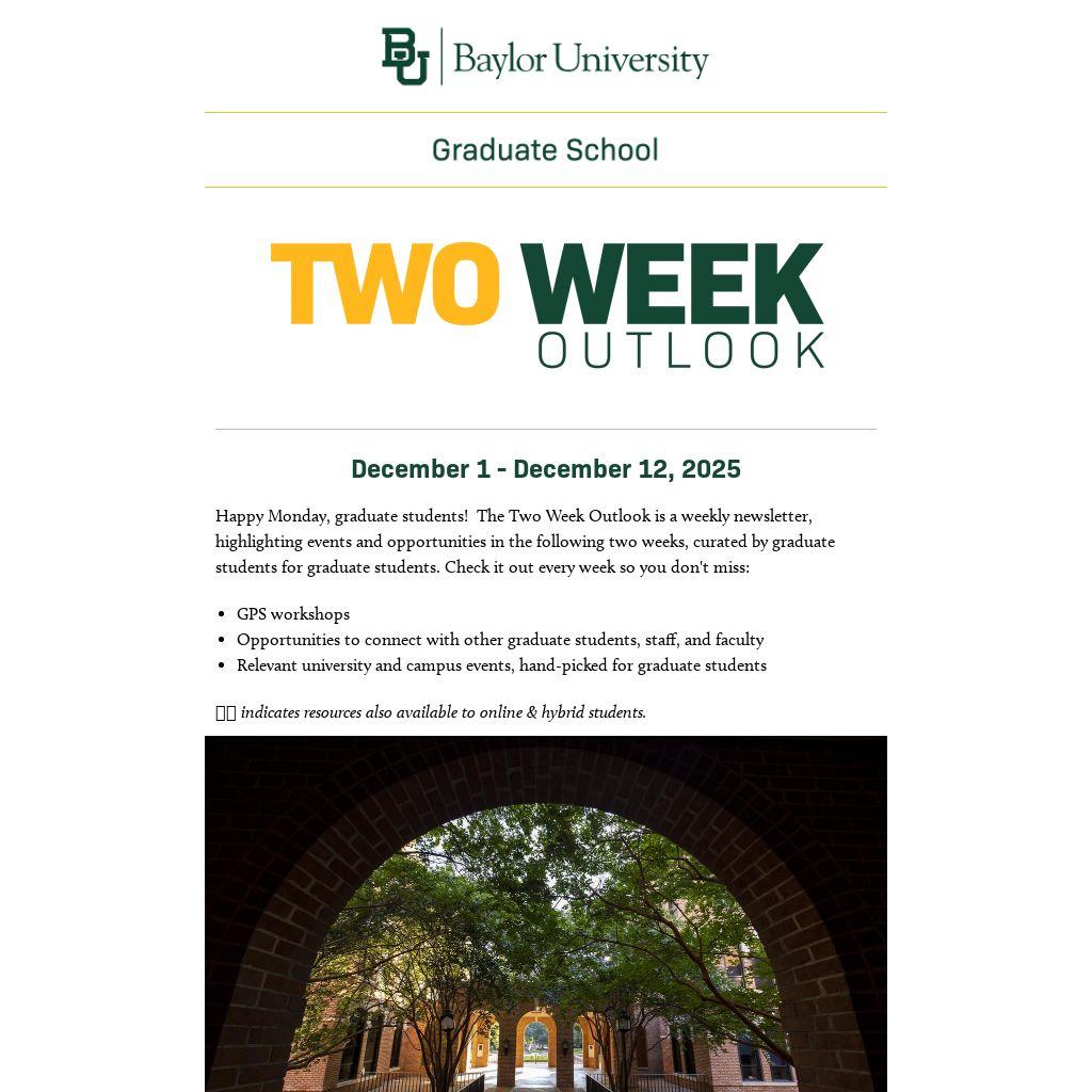 Happy Monday, graduate students! Â The Two Week Outlook is a weekly newsletter, highlighting events and opportunities in the following two weeks, curated by graduate students for graduate students. Check it out every week so you don't miss: