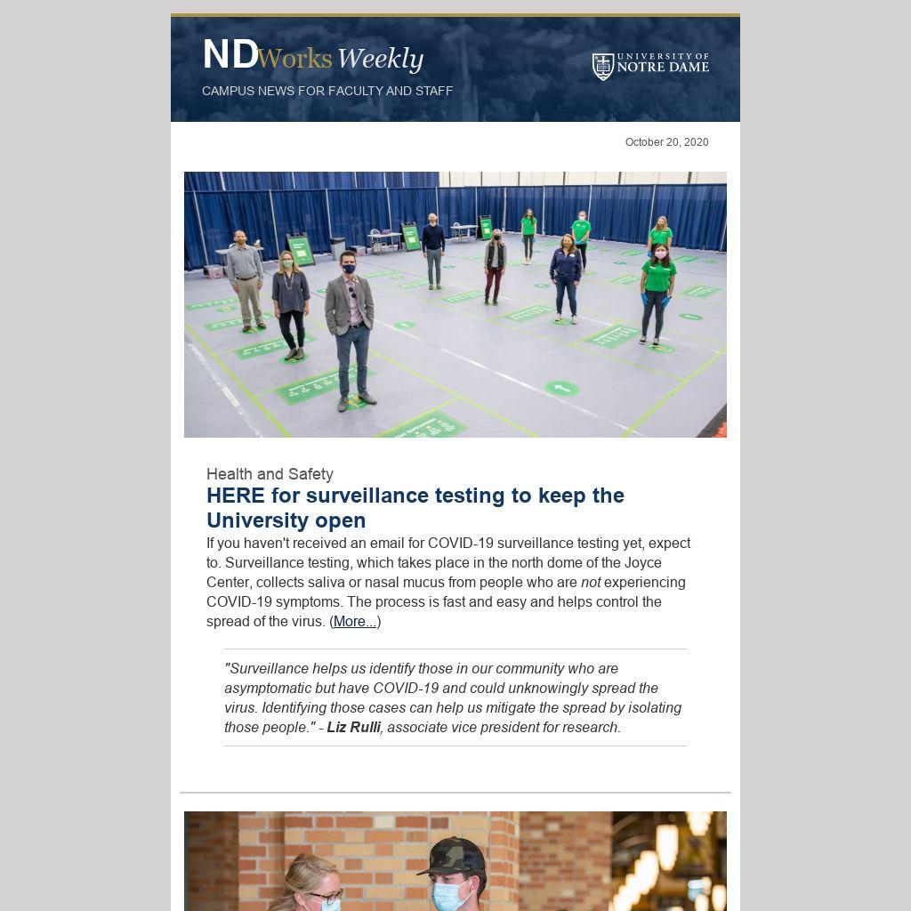 If you haven't received an email for COVID-19 surveillance testing yet, expect to. Surveillance testing, which takes place in the north dome of the Joyce Center, collects saliva or nasal mucus from people who are not experiencing COVID-19 symptoms. The process is fast and easy and helps control the spread of the virus. (More...)