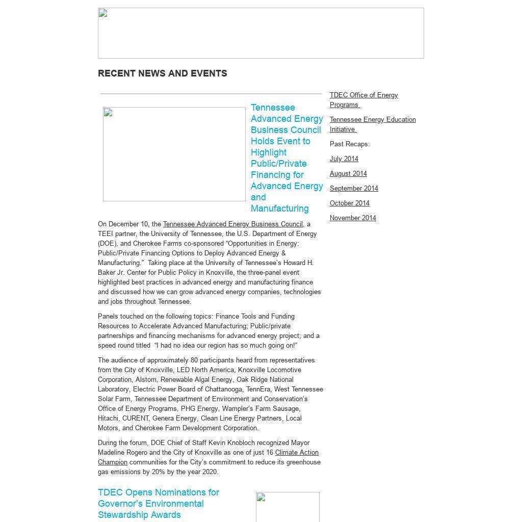 | Tennessee Advanced Energy Business Council Holds Event to Highlight Public/Private Financing for Advanced Energy and Manufacturing On December 10, the Tennessee Advanced Energy Business Council, a TEEI partner, the University of Tennessee, the U.S. Department of Energy (DOE), and Cherokee Farms co-sponsored “Opportunities in Energy: Public/Private Financing Options to Deploy Advanced Energy & Manufacturing.” Taking place at the University of Tennessee’s Howard H. Baker Jr. Center for Public Policy in Knoxville, the three-panel event highlighted best practices in advanced energy and manufacturing finance and discussed how we can grow advanced energy companies, technologies and jobs throughout Tennessee. Panels touched on the following topics: Finance Tools and Funding Resources to Accelerate Advanced Manufacturing; Public/private partnerships and financing mechanisms for advanced energy project; and a speed round titled “I had no idea our region has so much going on!” The audience of approximately 80 participants heard from representatives from the City of Knoxville, LED North America, Knoxville Locomotive Corporation, Alstom, Renewable Algal Energy, Oak Ridge National Laboratory, Electric Power Board of Chattanooga, TennEra, West Tennessee Solar Farm, Tennessee Department of Environment and Conservation’s Office of Energy Programs, PHG Energy, Wampler’s Farm Sausage, Hitachi, CURENT, Genera Energy, Clean Line Energy Partners, Local Motors, and Cherokee Farm Development Corporation. During the forum, DOE Chief of Staff Kevin Knobloch recognized Mayor Madeline Rogero and the City of Knoxville as one of just 16 Climate Action Champion communities for the City’s commitment to reduce its greenhouse gas emissions by 20% by the year 2020.