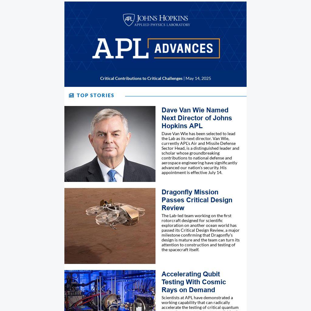 In this issue: Dave Van Wie Named Next Director of Johns Hopkins APL,