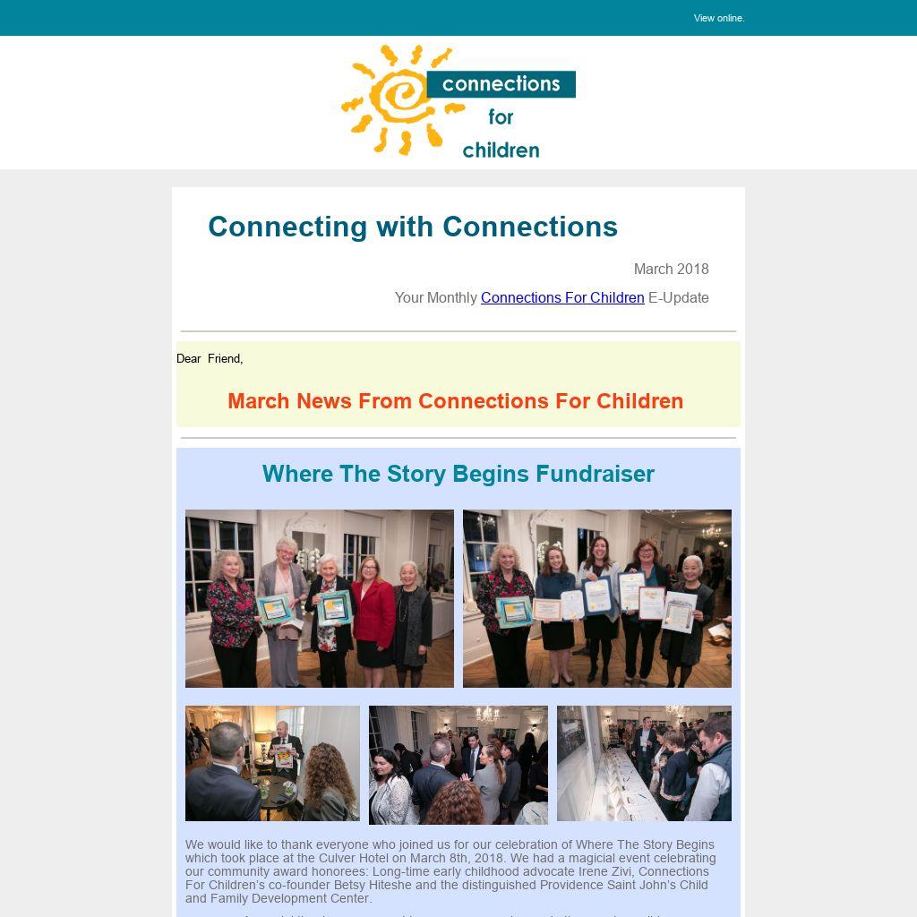 We would like to thank everyone who joined us for our celebration of Where The Story Begins which took place at the Culver Hotel on March 8th, 2018. We had a magicial event celebrating our community award honorees: Long-time early childhood advocate Irene Zivi, Connections For Children’s co-founder Betsy Hiteshe and the distinguished Providence Saint John’s Child and Family Development Center.