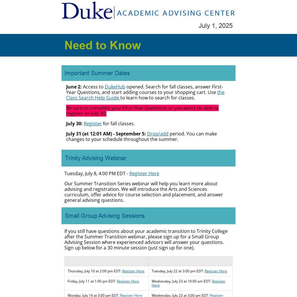 June 2: Access to DukeHub opened. Search for fall classes, answer First-Year Questions, and start adding courses to your shopping cart. Use the Class Search Help Guide to learn how to search for classes.