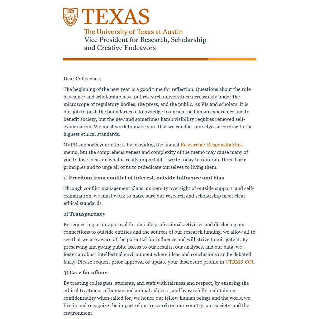 Thank you for working with us to keep UT a leader in scholarship and research while it maintains the highest ethical standards.