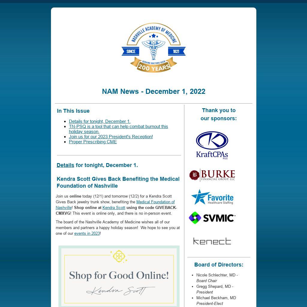 The holidays are all about joy and gratitude, but they can be a tough time for individuals struggling with burnout, depression, or other challenges. We are pleased to let you know about a unique online resource that is available to physicians and other licensed health professionals across Tennessee. NAM is dedicated to supporting the mental health of its members. The Tennessee Professional Screening Questionnaire, or TN-PSQ, is a free service being offered to our members that allows you to anonymously: