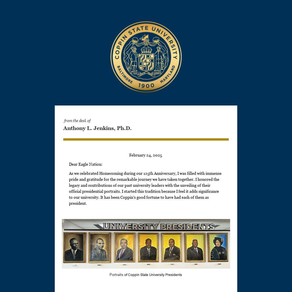 As we celebrated Homecoming during our 125th Anniversary, I was filled with immense pride and gratitude for the remarkable journey we have taken together. I honored the legacy and contributions of our past university leaders with the unveiling of their official presidential portraits. I started this tradition because I feel it adds significance to our university. It has been Coppin's good fortune to have had each of them as president.