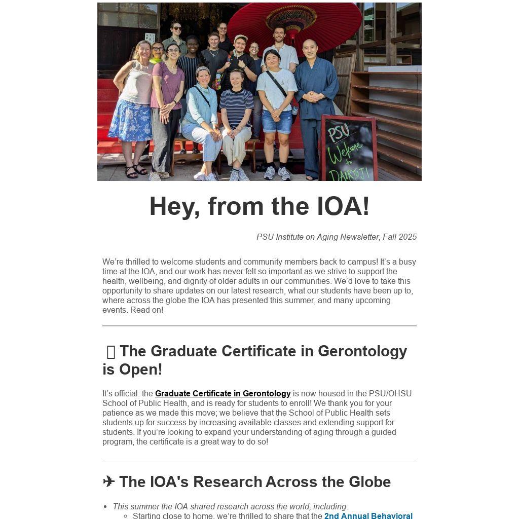 Nov 4 @ 1PM | GSA Student Chapter Kickoff Meeting: All PSU students (undergrad or graduate) are invited to join the GSA student chapter! We meet virtually each month and collaborate on age-related projects and build community around working/wanting to work in the field of aging.