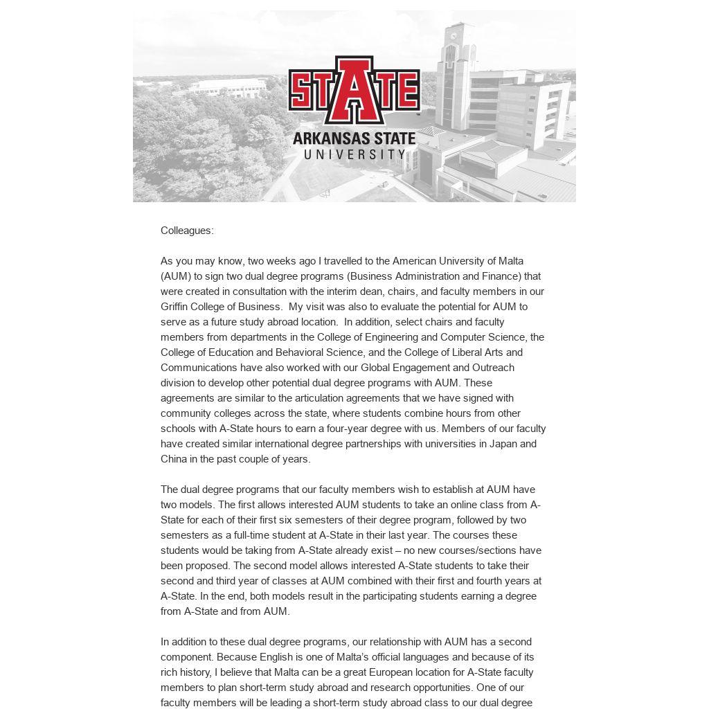 As you may know, two weeks ago I travelled to the American University of Malta (AUM) to sign two dual degree programs (Business Administration and Finance) that were created in consultation with the interim dean, chairs, and faculty members in our Griffin College of Business. My visit was also to evaluate the potential for AUM to serve as a future study abroad location. In addition, select chairs and faculty members from departments in the College of Engineering and Computer Science, the College of Education and Behavioral Science, and the College of Liberal Arts and Communications have also worked with our Global Engagement and Outreach division to develop other potential dual degree programs with AUM. These agreements are similar to the articulation agreements that we have signed with community colleges across the state, where students combine hours from other schools with A-State hours to earn a four-year degree with us. Members of our faculty have created similar international degree partnerships with universities in Japan and China in the past couple of years.