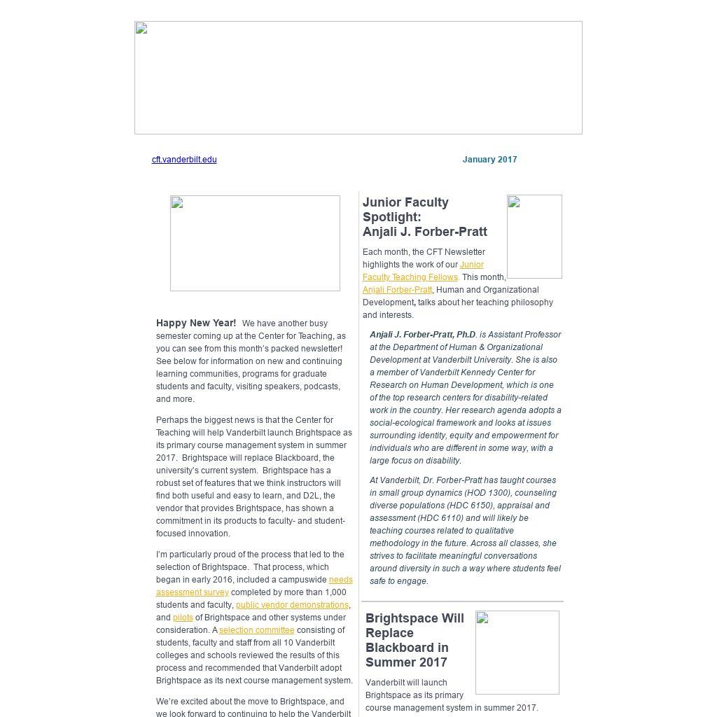 Happy New Year! We have another busy semester coming up at the Center for Teaching, as you can see from this month’s packed newsletter! See below for information on new and continuing learning communities, programs for graduate students and faculty, visiting speakers, podcasts, and more. Perhaps the biggest news is that the Center for Teaching will help Vanderbilt launch Brightspace as its primary course management system in summer 2017. Brightspace will replace Blackboard, the university’s current system. Brightspace has a robust set of features that we think instructors will find both useful and easy to learn, and D2L, the vendor that provides Brightspace, has shown a commitment in its products to faculty- and student-focused innovation. I’m particularly proud of the process that led to the selection of Brightspace. That process, which began in early 2016, included a campuswide needs assessment survey completed by more than 1,000 students and faculty, public vendor demonstrations, and pilots of Brightspace and other systems under consideration. A selection committee consisting of students, faculty and staff from all 10 Vanderbilt colleges and schools reviewed the results of this process and recommended that Vanderbilt adopt Brightspace as its next course management system. We’re excited about the move to Brightspace, and we look forward to continuing to help the Vanderbilt teaching community use course management tools to support teaching and learning. For more information on Brightspace and the upcoming transition, see our Brightspace support site. One more bit of news: The CFT will hold its annual Course Design Institute the week of May 8th. If you’re a faculty member thinking about designing or redesigning a course this summer, look for the call for applications in our February newsletter! Derek Bruff, PhD