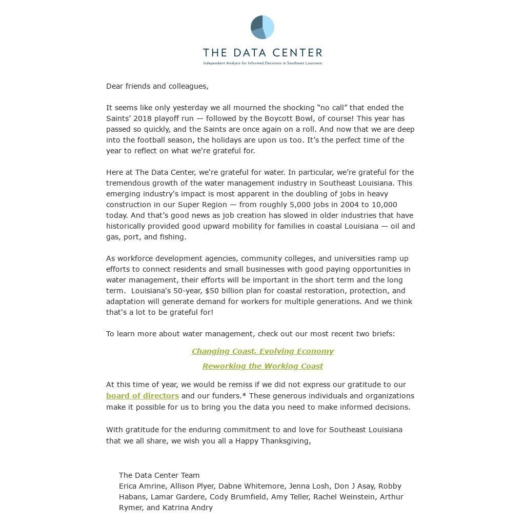 With gratitude for the enduring commitment to and love for Southeast Louisiana that we all share, we wish you all a Happy Thanksgiving,
