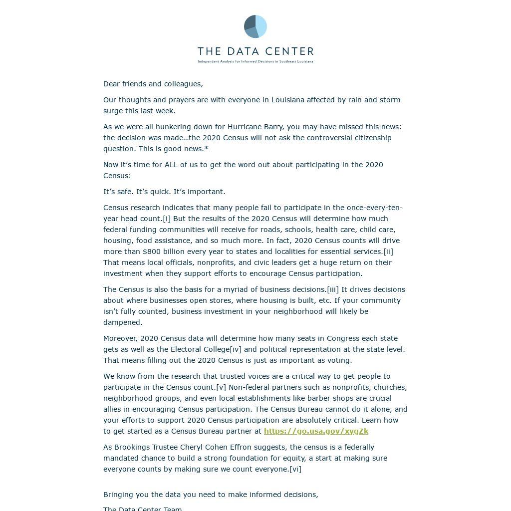 As we were all hunkering down for Hurricane Barry, you may have missed this news: the decision was made…the 2020 Census will not ask the controversial citizenship question. This is good news.*